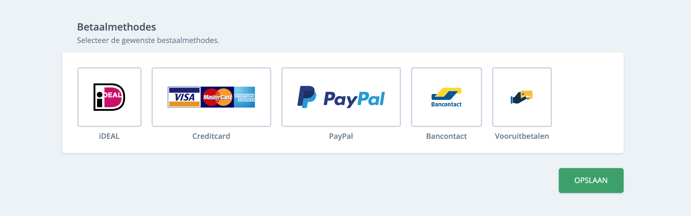 Nadat de Mollie key ingevuld is kun je zelf kiezen welke betaalmethodes je wil bieden aan jouw klanten. Op de betaalmethodespagina kun je aanvinken welke betaalmethodes worden getoond.